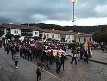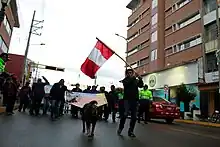 La Crisis Sociopolítica en el Perú [19][20][21] o el estallido peruano[22][23][24][lower-alpha 4] fue una serie de manifestaciones sucedidas en el Perú iniciadas el 7 de diciembre de 2022 (primera etapa de protestas), con interrupciones, hasta mediados de marzo de 2023 (segunda etapa de protestas),[26] mediante el desgaste masivo del evento con anterioridad, enmarcadas en la crisis política que azota al país desde 2021, e inclusive con antecedentes al 2016.[27] Estas protestas comenzaron en las ciudades de Lima, Apurímac y Arequipa y Puno,[28] pero se fueron propagando a lo largo de todo el país.[29] Son convocadas en su mayoría por diversas organizaciones sociales (principalmente sindicales, indígenas, estudiantiles, campesinas) de izquierda política,[30] que a lo largo del tiempo sumarían el apoyo de partidos políticos con espectro ideológico de centro a extrema izquierda.[31] No obstante, las protestas se caracterizan por la carencia de un liderazgo centralizado[32] y la incorporación, en distintos niveles, de un amplio espectro social, principalmente de los sectores más pobres y excluidos del país.[33]