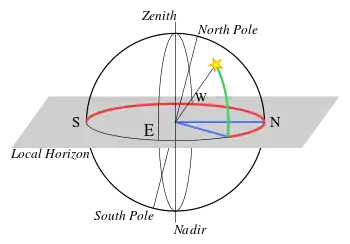 | Horizontales (altazimutales) | Observador (coordenadas topocéntricas) | Cenit y nadir | Horizonte | Altura (a) o elevación | Azimut (A) | Puntos cardinales Norte o Sur en el horizonte |