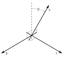El caso 3D más simple de un sistema de coordenadas oblicuas es un sistema cartesiano en el que uno de los ejes (por ejemplo, el eje x) se ha desviado según un ángulo dado , permaneciendo ortogonal a uno de los dos ejes restantes. Para este ejemplo, se ha desviado el eje x de un sistema de coordenadas cartesianas hacia el eje z según un ángulo , permaneciendo ortogonal al eje y.