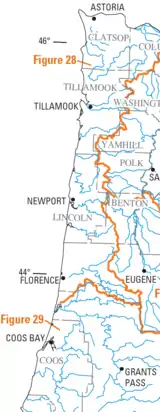 Los siguientes ríos tienen sus cabeceras en la Cordillera de la Costa de Oregón: