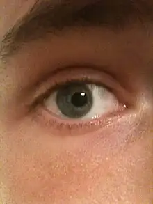 Ojo derecho de un paciente con pupila desplazada de su posición normal o corectopía.