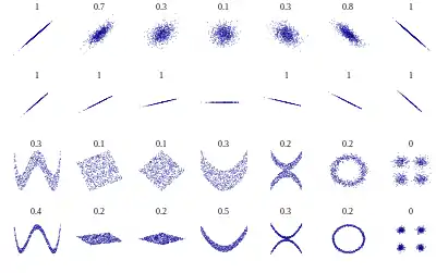 La correlación de la distancia[2][3] de dos variables aleatorias se obtiene dividiendo su covarianza de la distancia por el producto de sus desviaciones estándar de la distancia. La correlación de la distancia es