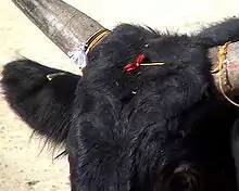 - Dos borlas, de lana blanca, son colgadas por un cordón en la base de cada cuerno. Se dice que las borlas, introducidas en los años 20 para mejorar el juego, evocan los genitales perdidos del toro.[16]