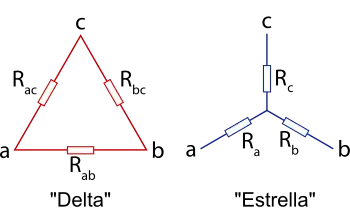 Los conductores de los tres electroimanes pueden conectarse en estrella o en triángulo. En la disposición en estrella cada bobina se conecta a una fase en un extremo y a un conductor común en el otro, denominado neutro. Si el sistema está equilibrado, la suma de las corrientes de línea es nula, con lo que el transporte puede ser efectuado usando solamente tres cables. En la disposición en triángulo o delta cada bobina se conecta entre dos hilos de fase, de forma que un extremo de cada bobina está conectado con otro extremo de otra bobina.[12]
