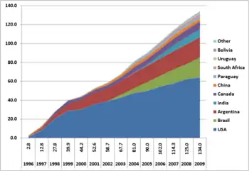 - Field areas 2009, Genetically modified plants: Global cultivation on 134 million hectares Archivado el 6 de noviembre de 2013 en Wayback Machine. GMO Compass. Retrieved 25 July 2010.