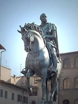 Una gran estatua ecuestre de Cosme I, erigida en Giambologna, se encuentra ahora en la Plaza de la Señoría, en Florencia.