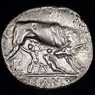 Mánu ('Hombre, humano') aparece en el Rigveda como el primer sacrificador y el fundador de la ley religiosa, las Leyes de Manu.[44][45] Es el hermano (o medio hermano) de Yama ('Gemelo'), ambos presentados como hijos de la deidad solar Vivasvat. La asociación de Mánu con el ritual del sacrificio es tan fuerte que a los que no sacrifican se les llama amanuṣāḥ, que significa 'no perteneciente a Mánu', 'distinto a Mánu' o 'inhumano'.[46] El canto de Puruṣa (otra palabra que significa 'hombre') cuenta cómo las partes del cuerpo del hombre primigenio sacrificado llevaron a la creación del cosmos (el cielo a partir de su cabeza, el aire a partir de su ombligo, la tierra a partir de sus piernas) y el castas hindú. (las partes superiores se convierten en las castas superiores y las inferiores en los plebeyos).[47][45][15] En el posterior Śatapatha Brāhmana, tanto un toro primordial como la esposa de Mánu, Manāvī, son sacrificados por los Asuraa (semidioses). Según Lincoln, esto podría representar una variante independiente del mito original, con la figura de Yama situada detrás de la de Manāvī.[48]