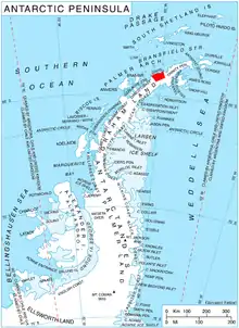 En las toponimias que siguen a la del Reino Unido la bahía Charcot no forma parte de la península Trinidad (o Luis Felipe), por lo que esta península es colindante con la costa Palmer. En otras toponimias como las de Chile y Estados Unidos esa península comienza en el cabo Kater (63°46′S 59°54′O) dentro de la costa Palmer.