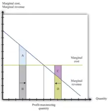 Por otro lado, el lado derecho de la línea negra (ingreso marginal = coste marginal), muestra que el coste marginal es mayor que el ingreso marginal. Supongamos que una empresa fija su producción en este lado, si reduce la producción, el coste disminuirá de y , lo que supera la disminución de los ingresos que es . Por lo tanto, la disminución de la producción hasta el punto de (ingreso marginal=coste marginal) dará lugar a un aumento de los beneficios.[5]