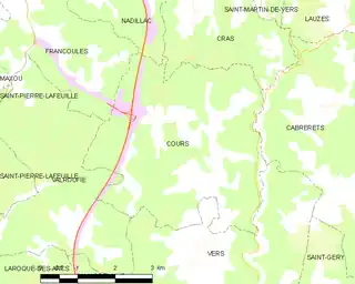 Cours era una comuna francesa situada en el departamento de Lot, de la región de Occitania, que el 1 de enero de 2017 pasó a ser una comuna delegada de la comuna nueva de Bellefont-la-Rauze[3] al fusionarse con las comunas de Laroque-des-Arcs y Valroufié.