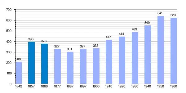 | Gráfica de evolución demográfica de Cozuelos de Fuentidueña[15] entre 1842 y 1960 |
