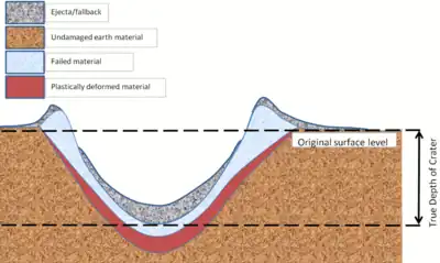 Un cráter está formado por un evento explosivo a través del desplazamiento y expulsión del material desde el suelo. Es típicamente en forma de cuenco. El gas de alta presión y las ondas de choque causan tres procesos responsables de la creación del cráter: