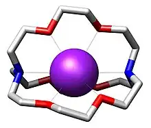 Los criptandos son una familia de ligandos multidentados sintéticos bi- y policíclicos que poseen afinidad por una variedad de cationes.[2] El Premio Nobel de Química de 1987 fue otorgado a Donald J. Cram, Jean-Marie Lehn —quien primero los estudio en 1969—, y Charles J. Pedersen por sus trabajos que permitieron descubrir y determinar los usos de criptandos y éteres de corona, dando comienzo al campo de la química supramolecular.[3] El término criptando implica que el ligando retiene substratos en una cripta, recluyendo al invitado como en un entierro. Estas moléculas son los análogos tridimensionales de los éteres de corona pero son más selectivos y atrapan a los iones con fuerzas mayores. Los complejos resultantes son lipofílicos.