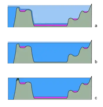 c: Deposición sincrónica en toda la cuenca. La clausura o restricción tectónica del paso de agua (gris oscuro) causa deposición de evaporitas simultáneamente en toda la cuenca; la cuenca podría no estar completamente seca, pues las sales se concentran por evaporación.[cita requerida]