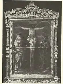La pintura representa el misterio del Calvario, con Jesucristo crucificado, y a sus pies tres personajes. Al lado izquierdo la Virgen María, al derecho el Apóstol San Juan, y a los pies de la cruz, una figura difuminada y en segundo plano que la historiografía tradicional ha interpretado como la de un ermitaño donante, pero que estudios recientes han asociado con San Pedro Apóstol, en la escena de la historia sagrada y de la iconografía de "las lágrimas de san Pedro". Interpretación sostenida en un inventario de 1620 en el que aparece la siguiente referencia: “hallo en la iglesia en el altar un/ cuadro grande de un Cristo crucificado/ con Ntra. Señora y San Juan y San Pedro a los pies/ que es la inspiración”.