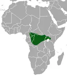 Se encuentra en Camerún, la República Centroafricana, República del Congo, República Democrática del Congo, Kenia y Uganda.