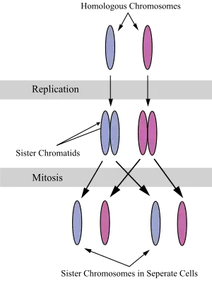 La recombinación mitótica es principalmente el resultado de procesos de reparación de ADN que responden a daños espontáneos o inducidos.[2][3][4] La reparación recombinacional homóloga durante la mitosis se limita en gran medida a la interacción entre las cromátidas hermanas cercanas que están presentes en una célula después de la replicación del ADN pero antes de la división celular. Debido a la relación cercana especial que comparten, las cromátidas hermanas no solo se prefieren a las cromátidas homólogas distantes como sustratos para la reparación recombinante, sino que tienen la capacidad de reparar más daños en el ADN que los homólogos.[1]