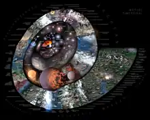Acontecimientos cosmológicos notables y otros de la historia natural representados en espiral. En el centro a la izquierda puede verse la supernova primigenia y continuando la creación del Sol, la Tierra y la Luna (por impacto de Theia)