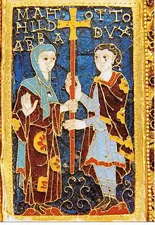 La Cruz de Otón y Matilde, o Primera Cruz de Matilde (en alemán: Otto-Mathilden-Kreuz) es una cruz procesional medieval de tipo gemada (cruz enjoyada) que se encuentra en el Tesoro de la catedral de Essen. Fue creada a finales del siglo X y se utilizaba en las fiestas mayores hasta hace poco. Lleva el nombre de las dos personas que aparecen en la placa esmaltada bajo el Cristo: Otón I, duque de Suabia y Baviera, y su hermana, Matilde II de Essen, abadesa de la abadía de Essen. Eran nietos del emperador Otón I y favoritos de su tío, Otón II. La cruz es uno de los objetos que demuestran la estrecha relación entre la casa real de Liudolfing y la abadía de Essen. Matilde se convirtió en abadesa de Essen en el año 973 y su hermano murió en el 982, por lo que se supone que la cruz se hizo entre esas fechas,[1] o uno o dos años más tarde si tenía una función conmemorativa de Otón. Al igual que otros objetos de Essen realizados bajo el patrocinio de Matilde, la ubicación del taller de orfebrería es incierta, pero, además de la propia Essen, se ha sugerido a menudo Colonia, y la placa de esmalte puede haberse realizado por separado en Tréveris.[2]