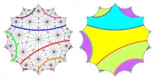La cuártica de Klein es un cociente del teselado heptagonal (comparar el grafo 3-regular en verde) y su teselado triangular dual (compárese con el grafo 7-regular en violeta)