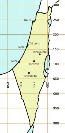 La proyección utilizada fue la proyección de Cassini-Soldner. El meridiano central (la línea de longitud a lo largo de la cual no hay distorsión local) fue elegido fue el que pasa a través de un marcador en la colina del Monasterio de San Elías al sur de Jerusalén.[1] El origen falso (punto cero) de la cuadrícula se colocó 100 km al sur y al oeste de la colina Ali el-Muntar que domina la ciudad de Gaza.[1] La unidad de longitud de la cuadrícula era el kilómetro; las unidades británicas ni siquiera fueron consideradas.[1]