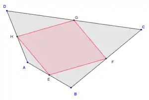 - Los cuatro triángulos más pequeños formados por las diagonales y los lados de un cuadrilátero convexo tienen la propiedad de que el producto de las áreas de dos triángulos opuestos es igual al producto de las áreas de los otros dos triángulos.[50]