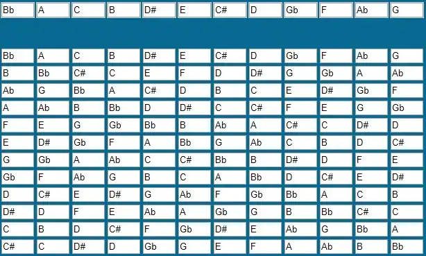 De la antedicha serie original 1 del Op. 28 de Webern, se genera la siguiente matriz dodecafónica, aquí en cifrado anglosajón: