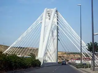 El puente fue construido sin ningún apoyo sobre el río Ebro, teniendo 140 m (metros) de luz para salvar ambas orillas. El tablero central, sobre el cual descansa la calzada, tiene 161 m de largo, 18,6 de ancho y 2 de canto. Éste es sujetado por un arco atirantado de 28 m de altura máxima. La estructura del arco es en realidad doble, formada por dos tubos de 1,2 m de diámetro, ligeramente inclinados entre sí para soportar mejor las fuerzas de flexión a las que están sometidos. El arco separa en dos ambos sentidos de circulación, disponiendo cada uno de dos carriles de 3,5 m de ancho.