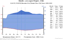 Los diagramas Walter Lieth muestran con un área azul claro los periodos en que las precipitaciones sobrepasan la cantidad de agua que el calor del sol evapora en el mismo lapso de tiempo, (un promedio de 10°C mensuales evaporan 20 mm de agua caída) dejando un clima húmedo. Por el contrario, las zonas amarillas indican que durante ese tiempo el agua caída puede ser evaporada por el calor del sol. En Maullín no hay tales periodos. El área azul obscura señala meses muy húmedos.