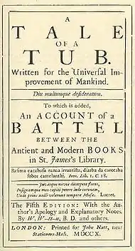 - Swift, Jonathan. Tale of a Tub, to which is added The battle of the books, and the Mechanical operation of the spirit. By Jonathan Swift. Together with The history of Martin, Wotton's Observations upon the Tale of a tub, Curll's Complete key, &c. A. C. Guthkelch y D. Nichol Smith, editores. Oxford: Clarendon Press, 2ª edición en 1958. Publicado sin ISBN.