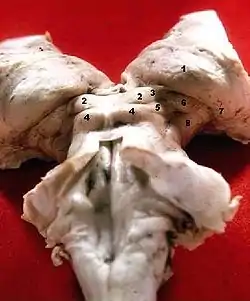 1.Núcleos pulvinares 2.Coliculos superiores 3.Rama de los coliculos superiores 4. Coliculos inferiores 5. Rama de los coliculos inferiores 6. Cuerpo geniculado medial 7. Cuerpo geniculado lateral 8. Tronco cerebral.