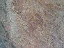 De las pinturas solo se conservan el guerrero que se dirige hacia otras dos figuras que quedan a su derecha y de las que solo se aprecian fragmentos. Una con torso y cabeza de un hombre y otra que parece parte de un animal.