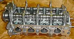 Las válvulas están en la culata, las de admisión en un lado y las de escape en el otro. Encima de cada fila de válvulas, se sitúa un árbol de levas que controla directamente las válvulas mediante un taqué o un diminuto balancín.