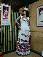 Se compone de blusa y falda de satín color blanca con cintas de color roja. La blusa es de cuello redondo con encaje y un pasalistón con una cinta roja intercalada, y mangas largas o de tres cuartos de puños recogidos y con cintas de color roja. La falda es de tres capas, cada una rematada con encajes y pasalistón con cintas rojas intercaladas en el encaje. Se usan como accesorios, un cinturón ancho de tela color rojo amarrado a la cintura, moño rojo en el cabello y zapatos negros cerrados de tacón bajo.[4]