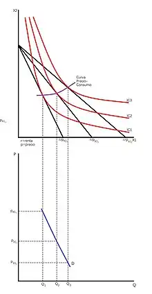 En economía, una curva precio-consumo es una curva que describe como los Conjuntos de Consumo cuando el precio de un bien cambia, manteniendo constante el ingreso, las preferencias y el precio del otro bien.[1][2] Estas curvas se generan al tomar los puntos donde se cruzan las curvas de indiferencia con las restricciones presupuestarias correspondientes, a medida que el precio de uno de los dos bienes cambia.[1] Las curvas de precio-consumo se utilizan para conectar conceptos de utilidad, curvas de indiferencia y restricciones presupuestarias con los modelos de oferta y demanda.[1] A cada precio le corresponde una cantidad única de cada uno de los bienes. Debido a esto, al modelar el bien con el precio variable como un bien particular y el bien con el precio constante como todos los demás bienes, la curva de precio-consumo se puede utilizar para construir la curva de demanda individual de un bien específico.[1][2][3]