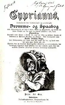 Un cuento anacrónico contado en la colección impresa danesa de hechizos Oldtidens Sortebog ("Libro Mágico de los Tiempos Antiguos") explica que Cyprianus era una piosa y hermosa monja mexicana del siglo catorce. En un cuento gótico se cuenta que el Oldtidens Sortebog provocó que Cyprianus fuera lanzada a una mazmorra en 1351. Mientras estaba encarcelada en la mazmorra, Cyprianus desgarró su ropa y transcribió su conocimiento mágico en los harapos, utilizando su propia sangre como tinta. Este texto fue encontrado entonces en un viejo castillo.[6]