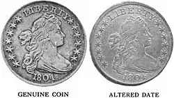 Se han creado falsificaciones y reproducciones falsas del dólar de 1804 desde que los numismáticos se dieron cuenta del alto valor de las monedas.[64] James A. Bolen, un medallista y coleccionista que creó copias de monedas valiosas entre 1862 y 1869, fabricó un dólar de 1804 al alterar el último dígito en la fecha de un ejemplar de 1803.[64] Aunque Bolen agregó su nombre al canto de la moneda, otros falsificadores crearon monedas de fecha alterada con la intención de engañar.[65] El actor de teatro del siglo XIX John T. Raymond compró un espécimen de la moneda, que luego se reveló que era una falsificación, por 300 dólares.[66] Aunque es posible modificar todas las monedas de dólar de plata fechadas entre 1800 y 1803, la de 1801 es la más utilizada para este propósito.[67][68]