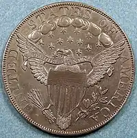 La Ley de la Moneda de 1792, la legislación que preveía el establecimiento de la Casa de Moneda de los Estados Unidos, autorizó la acuñación de múltiples denominaciones de monedas de oro, plata y cobre.[5] Según esta norma, el dólar, o «unidad», debía «ser del valor de un dólar español igual al que se utiliza hoy, y contener trescientos setenta y un granos y cuatro dieciseisavas partes de un grano de pureza, o cuatrocientos dieciséis granos de plata estándar».[5] La ley señalaba además que la moneda se acuñaría en una aleación de un 89,2 % de plata y 10,8 % de cobre.[5] Los estándares de pureza y peso descritos en la legislación se basaron en la media de varios ensayos realizados en dólares españoles.[6] Sin embargo, estas piezas estaban obligadas por la ley española a contener un 90,2 % de plata, y la mayoría de los ejemplares no gastados que se encontraban en circulación en Estados Unidos en ese momento contenían aproximadamente 1,75 granos (0,113 g) más que los dólares de plata autorizados por la ley.[7] En 1793 el presidente George Washington promulgó una legislación que declaraba moneda de curso legal a los dólares españoles, siempre que pesaran no menos de 415 granos (26,9 g), lo que significaba que con el peso más bajo permitido por la ley, estas piezas contendrían aproximadamente 0,5 % menos plata que las monedas de un dólar estadounidense.[8][9] Como resultado, las unidades de plata estadounidenses y las unidades españolas que tenían más granos de plata quedaron en gran medida fuera de circulación de acuerdo con la ley de Gresham; las monedas españolas más ligeras se enviaron en gran cantidad para su circulación en los Estados Unidos, mientras que las piezas más pesadas se entregarían a la Casa de Moneda de Filadelfia para ser reacuñadas como estadounidenses y así aprovechar la discrepancia en el peso.[9] En ese momento, la plata era suministrada a la Casa de Moneda exclusivamente por depositantes privados, quienes, de acuerdo con la Ley de la Moneda de 1792, tenían derecho a que su metal fuera acuñado de forma gratuita.[5][10] Como las grandes piezas de plata eran el método preferido de comercio en todo el mundo, especialmente en China, un número considerable de los dólares estadounidenses se exportaron para satisfacer esa demanda.[9]