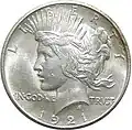 El 28 de diciembre, el superintendente de la Casa de la Moneda de Filadelfia, Freas Styer, envió un telegrama a Baker, que estaba en San Francisco, en el que le confirmaba la primera acuñación del dólar de la paz. La Casa de la Moneda informó más tarde que 1 006 473 piezas se acuñaron en 1921, una tasa de producción durante los cuatro días que quedaban para terminar el año que Burdette denomina «asombrosa»; él conjetura que la acuñación de dólares de la paz de 1921 continuó en 1922. La primera moneda que se acuñó se iba a enviar al presidente Harding, pero lo que ocurrió fue de algún modo misterioso: O'Reilly indicó que ella había enviado la moneda a Harding, pero el inventario patrimonial de Harding, preparado después de que el presidente muriera en el cargo menos de dos años después, no lo menciona, ni hay ninguna alusión a la moneda en los papeles de Harding.[5] Breen, en su obra anterior sobre monedas estadounidenses, declaró que la moneda fue entregada a Harding por el mensajero el 3 de enero de 1922, pero no indica la fuente de su información. Algunas pruebas de la producción de 1921 fueron acuñadas en la fase previa, en acabados satinados y mate, pero se desconoce exactamente cuántas se crearon con cualquiera de los dos acabados; los historiadores numismáticos Leroy Van Allen y A. George Mallis estiman que el total de acuñaciones fue de veinticuatro del primer y cinco del segundo.[1]