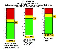 La imagen mostrada de un medidor digital de la aplicación Metric Halo, llamado SpectraFoo, utiliza la escala del Sistema-K, calibrada para -20, -14 o -12 dB. Mostrando el nivel de señal, como un indicador de cuantos de los 20, 14 o 12 decibelios seleccionados por el rango elegido permanecen por debajo del Fondo de Escala Digital. Si se obtienen más de 3 muestras en el fondo de escala digital implica que la forma de onda reconstruida esta recortada, ya que habría excedido la amplitud máxima, y sería "aplanada". (El Sistema-K fue inventado por el ingeniero de masterización, Bob Katz, de Digital Domain, en Altamonte Springs, Florida.).