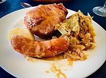 Todas estas características la han 'emparentado' en la mesa con otro plato muy tradicional en la comarca que se denomina Botillo. Sin duda el rey de la gastronomía berciana desde tiempos inmemoriales y un plato tradicional que se ha hecho imprescindible en fiestas y celebraciones de la zona. Se trata de un producto cárnico que se ha mantenido en la cultura popular como embutido emblemático, gracias a la tradición heredada en la zona. Los ingredientes básicos del botillo son: costilla de cerdo (mínimo 65% y máximo 90%) y rabo de cerdo (mínimo 10% y máximo 20%), a los que también se puede añadir, a criterio de quien lo elabore, otros componentes como lengua, carrillera, paleta y espinazo, en un máximo del 20% del total. Se sirve con patatas y berza cocida.