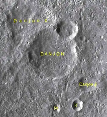 Danjon es un cráter de impacto situado en la cara oculta de la Luna. Se encuentra a menos de un diámetro al este-sureste del cráter de mayor tamaño Langemak. Al este-noreste de Danjon aparece el cráter Perepelkin, y hacia el sur se halla la llanura amurallada del cráter Fermi.