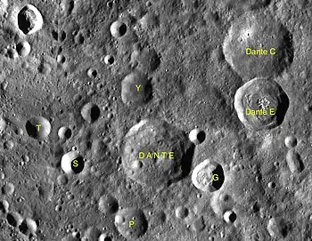 ![]() Localización del cráter Dante. Fotografía de la misión Lunar Reconnaissance Orbiter. |