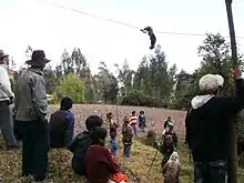 Empieza el cruce del 'río' con el desplazamiento, a través de cable, del maman awqa, sujeto al cable por un artilugio de rama natural, en uve volteada o la llamada "kullawya", y amarrado a la cintura del nauta aéreo con correíllas de cuero; en llegando al extremo opuesto se baja. Las pallas lo reciben con franca alegría, le invitan un terrón de sal, hasta un bizcocho de la costa. Uno por uno van cruzando por el cable los demás. Casi todos, para enseñar sus destrezas, se detienen a media travesía, puesto en vertical giran cual rosa náutica. Concluye la travesía aérea con el paso del awkin y del cajero.