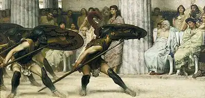 - En el asedio durante la Guerra de Troya, Aquiles, antes de incinerar a los muertos, bailó pirros (πυρά) en la plataforma de leña antes de llevar a Patroclo al funeral.