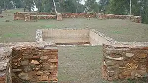 El conjunto de edificios se distribuye alrededor de un patio rectangular, con alberca en el centro. Esta se conserva incluso con el solado, y aún permanecen visibles restos de sus canalizaciones y desagües. En torno al patio, se pueden apreciar diversas estancias, en las que aún se conservan fragmentos del pavimento.