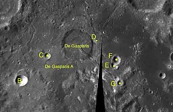 Por convención estos elementos son identificados en los mapas lunares poniendo la letra en el lado del punto medio del cráter que está más cerca de De Gasparis.