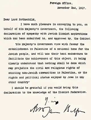 La Declaración Balfour (2 de noviembre de 1917) fue una manifestación formal pública del gobierno británico durante la Primera Guerra Mundial, para anunciar su apoyo al establecimiento de un «hogar nacional» para el pueblo judío en la región de Palestina, que en ese entonces formaba parte del Imperio otomano. La Declaración fue incluida en una carta firmada por el ministro de Relaciones Exteriores británico (Foreign Office) Arthur James Balfour y dirigida al barón Lionel Walter Rothschild, un líder de la comunidad judía en Gran Bretaña, para su transmisión a la Federación Sionista de Gran Bretaña e Irlanda. El texto fue publicado en la prensa el 9 de noviembre de 1917.