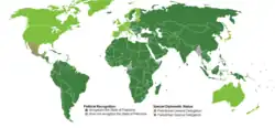 Reconocido por 94 países tras su proclamación,[6] el Estado palestino carece de independencia de facto, y su extensión geográfica se identifica generalmente con los Territorios Palestinos. En enero de 2012, 130 países miembros de la ONU habían reconocido formalmente el Estado de Palestina.[7]