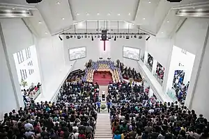 En el cristianismo evangélico, la dedicación de un edificio de la iglesia por lo general tiene lugar durante un servicio.[2] Una placa de dedicación también se adjunta al edificio.[3]